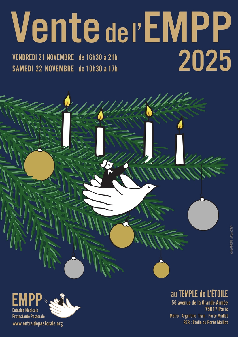 Chaque année, au mois de novembre, l’Entraide Médicale Protestante Pastorale organise à Paris une vente destinée à récolter des fonds à répartir selon les besoins médicaux des familles pastorales. Cette vente, qui se déroule sur deux jours successifs au Temple de l’Étoile, est un moment privilégié de convivialité et d’échange, en particulier lors du déjeuner du samedi. Ouverte à tous, adhérents ou non, elle est l’occasion de soutenir l’association en faisant des achats de Noël à des prix raisonnables.